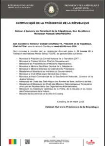 Selon le communique paru ce Mercredi 4 Mars 2026,le président Mamadi Doumbouya sera de retour a Conakry le Vendredi 6 Mars 2026.